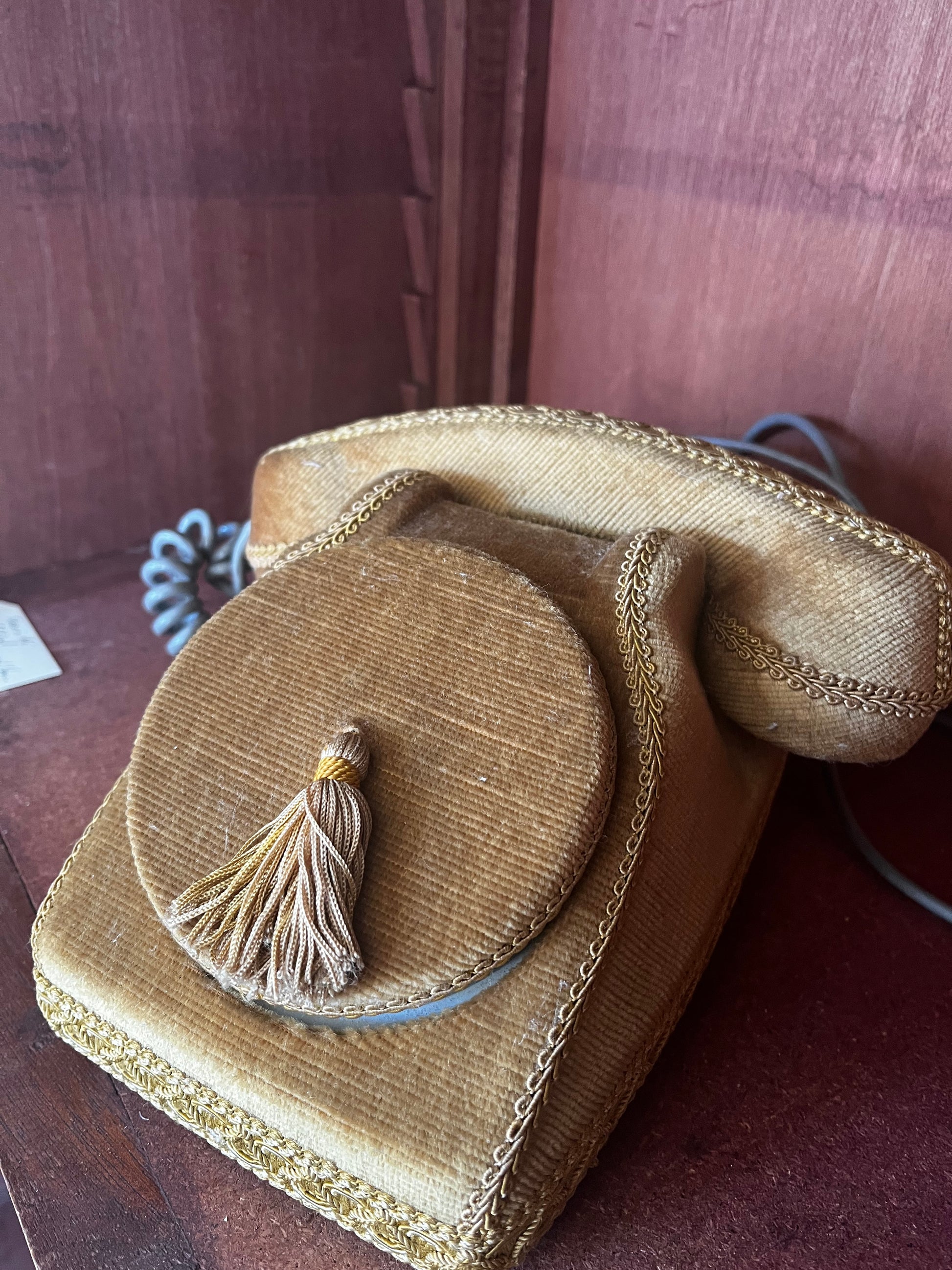 Téléphone gris à cadran des années 70 avec sa coque en velours vert.